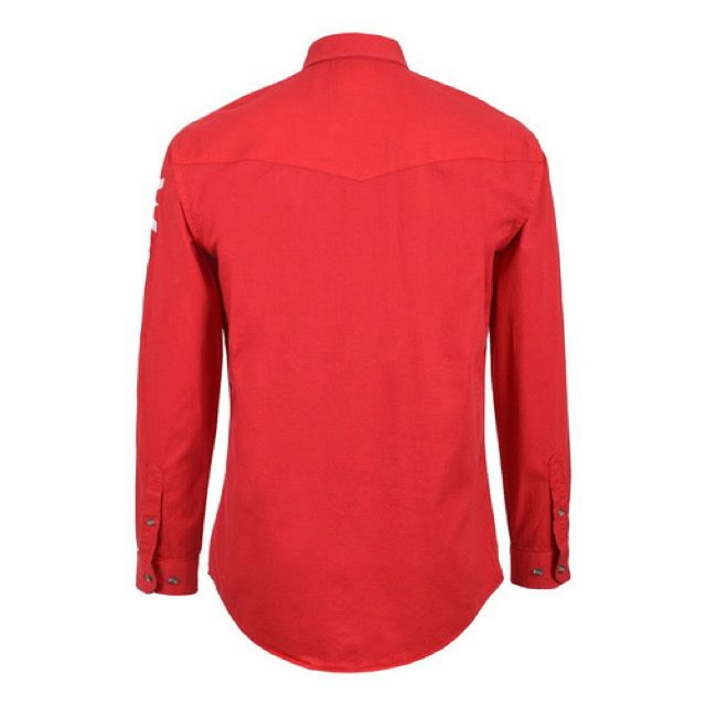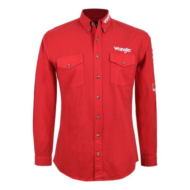Camisa Wrangler roja vaquera para hombre de manga larga, diseño liso con estampados, botones al frente, bolsillos frontales con broches de presión, material algodón, puño redondo, cuello button down.